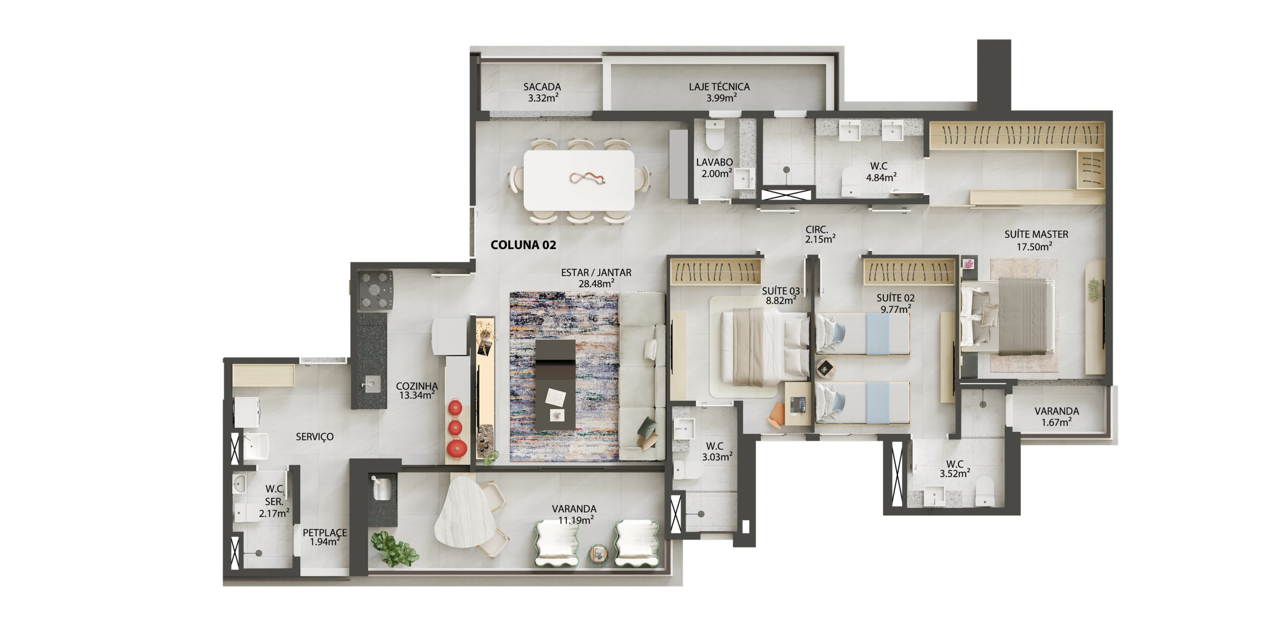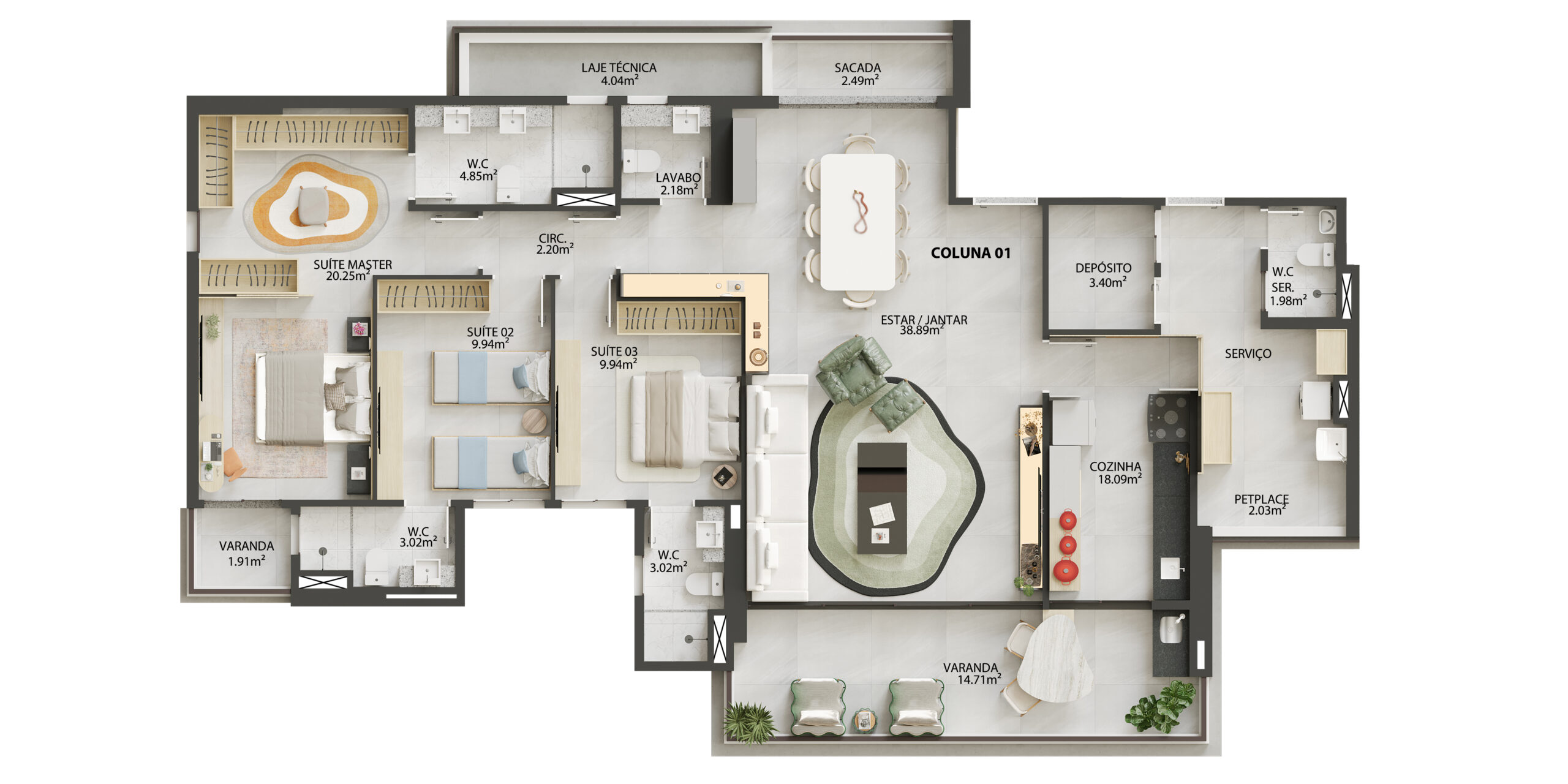 Coluna 1 – 167,90m² – Hall privativo, Sala de Estar e Jantar com sacada, cozinha, varanda gourmet, suíte casal com closet e varanda, lavabo, área de serviço , petplace.