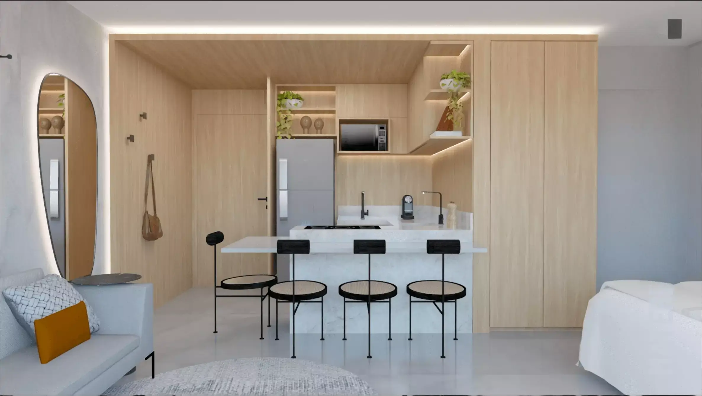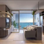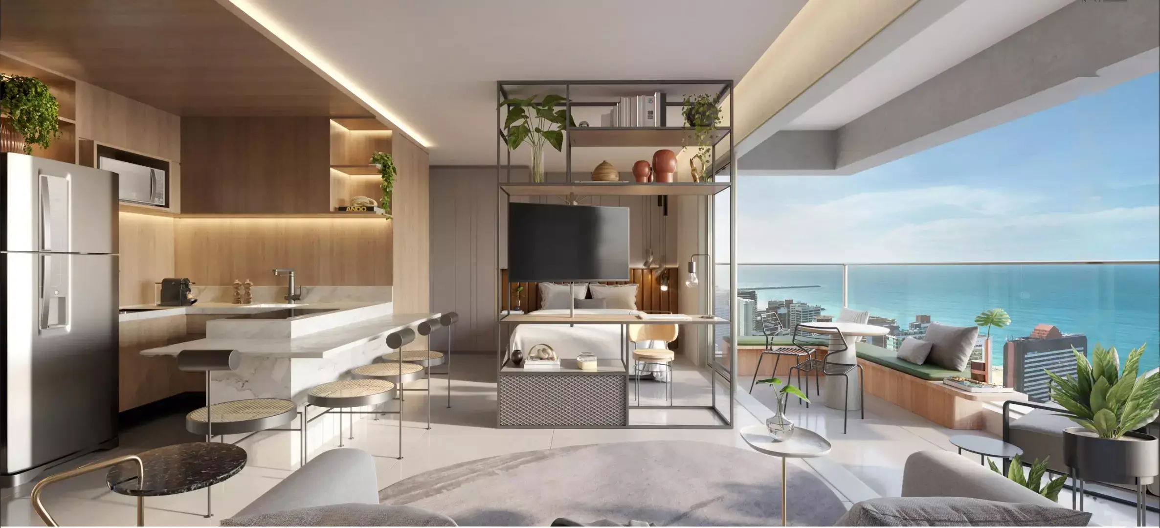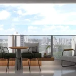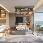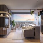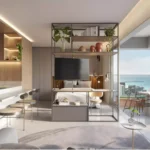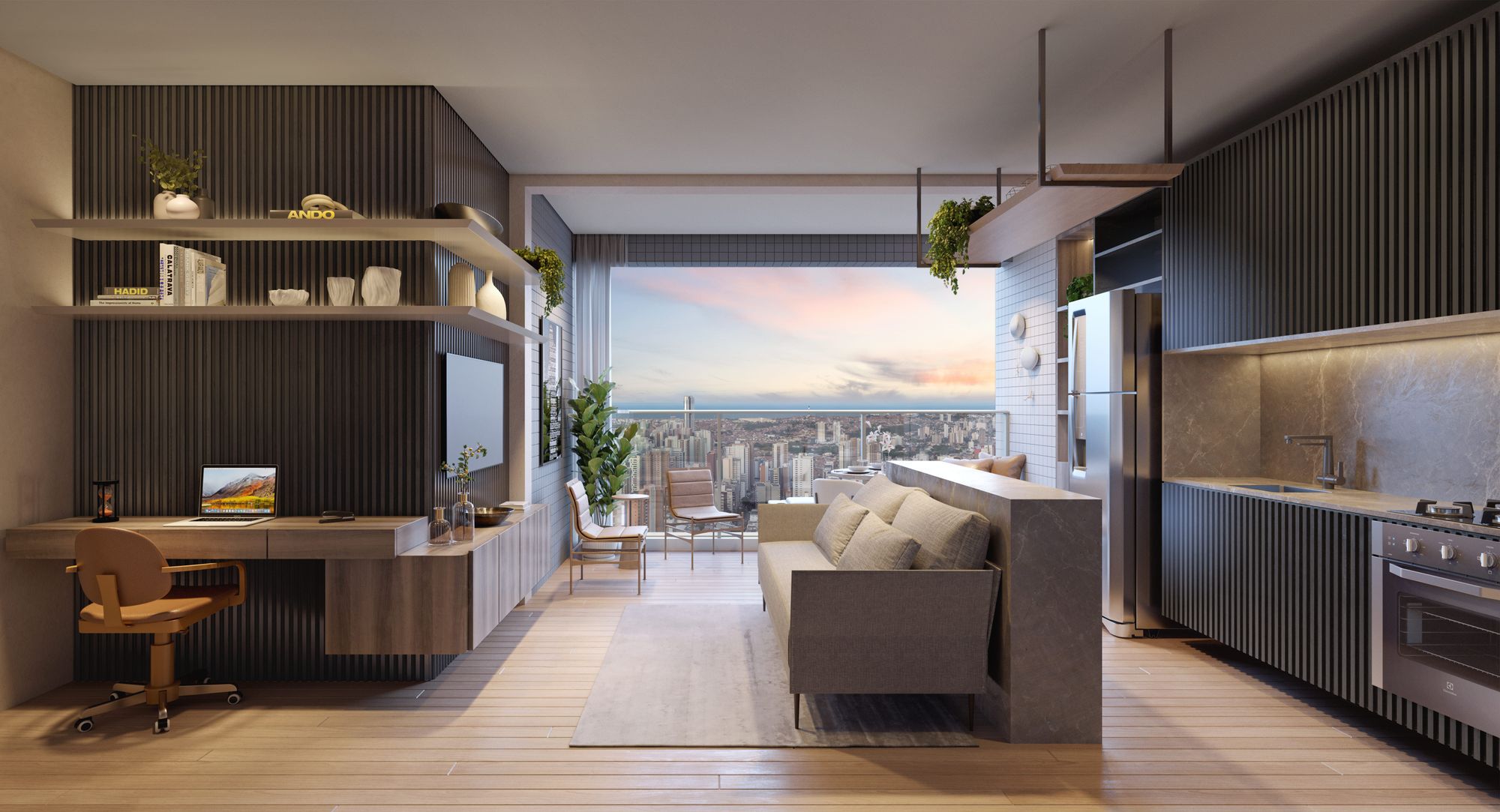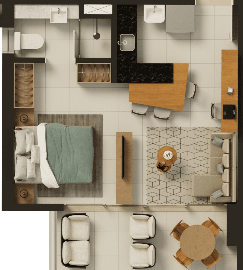 Studio de 40 m² – 1 suíte, sala, cozinha, varanda, ambiente integrado.