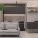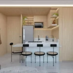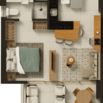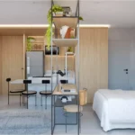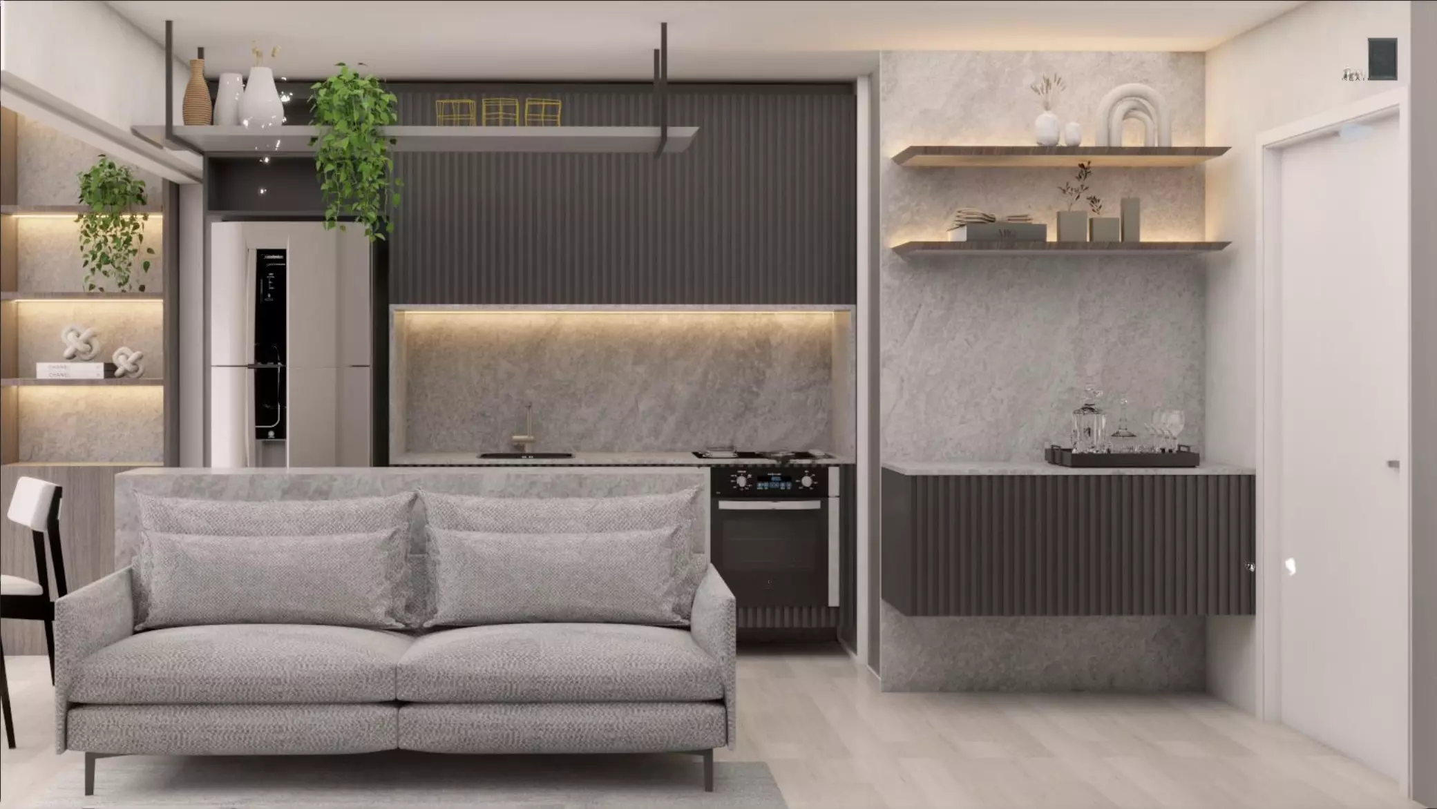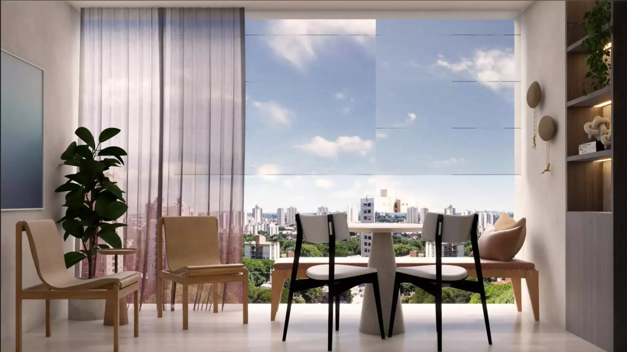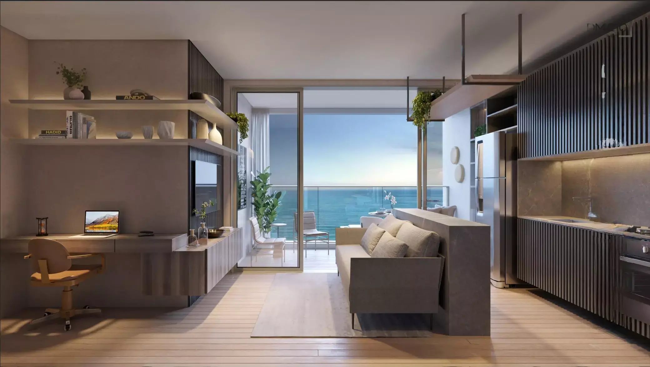 Studio de 40 m² – 1 suíte, sala, cozinha, varanda, ambiente integrado.