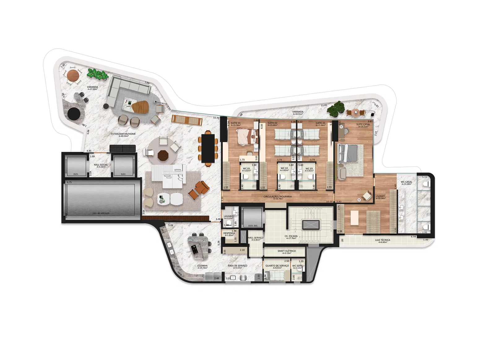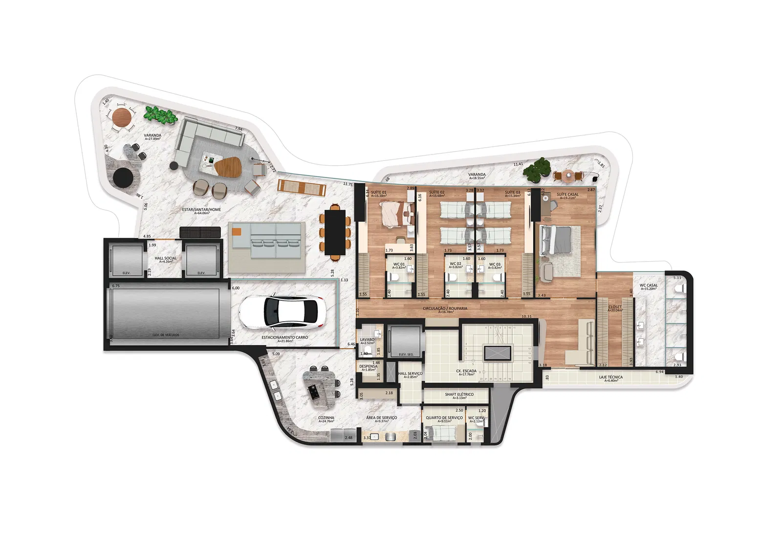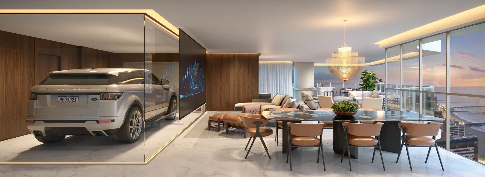 A área de lazer é completa, uma piscina com borda infinita a 90 m de altura, um Skydrive, tomada para carro elétrico, heliponto e muito mais.