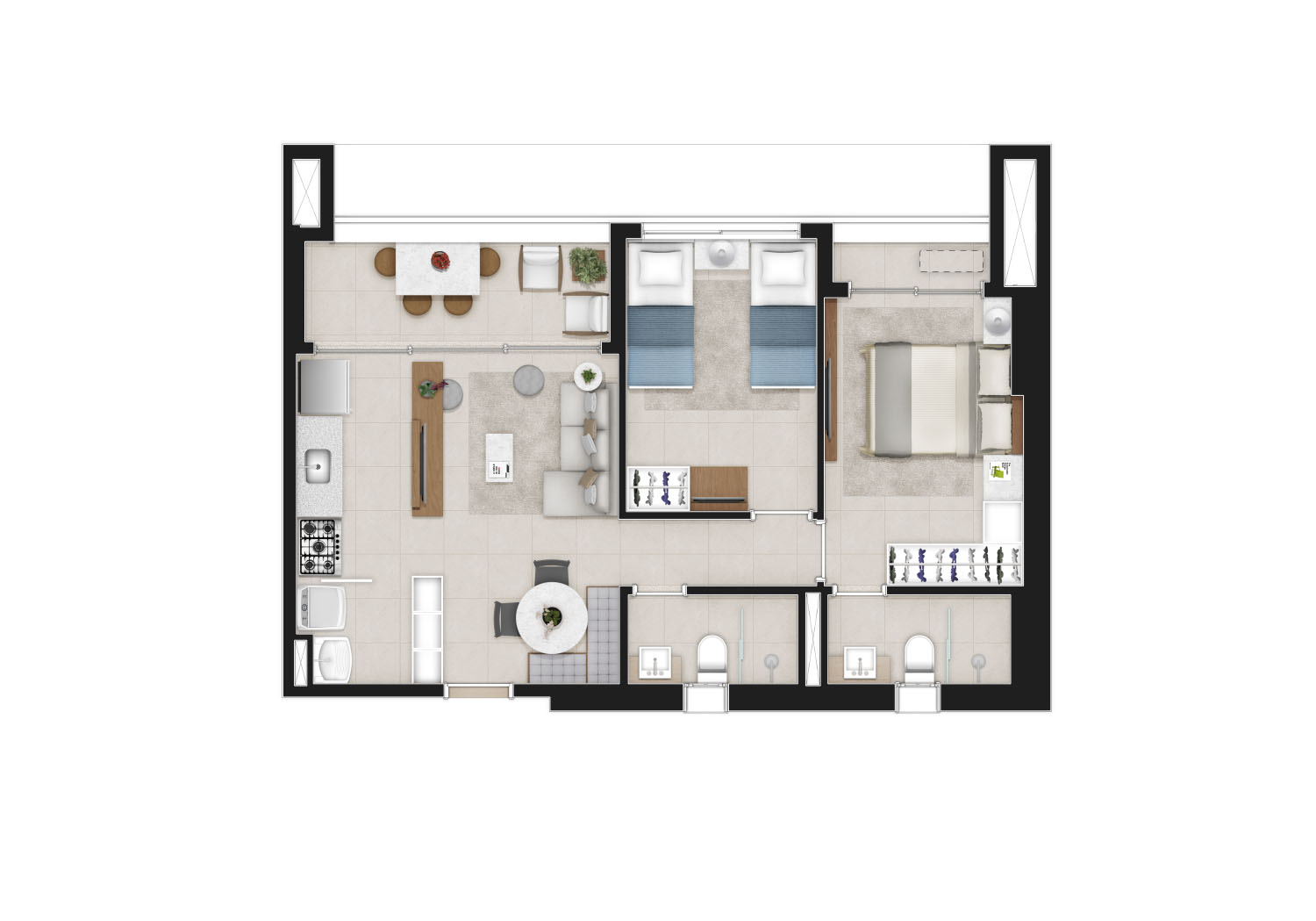 CONFORT : 59m² – 1 suíte -1 quarto- WC Social – 1 vaga