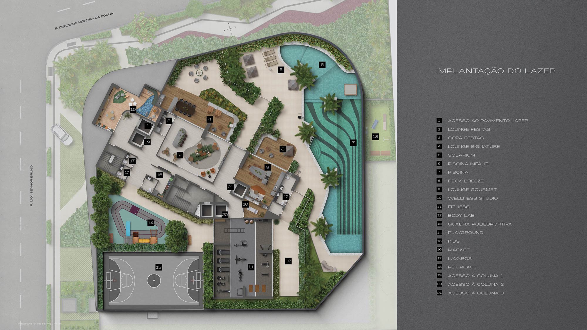 Lounge festas, Lounge Signature, Solarium, piscina, Deck Breeze, Lounge gourmet, Wellness Studio, fitness, Body Lab, quadra poliesportiva, playground, espaço kids, market, delivery room e pet place.